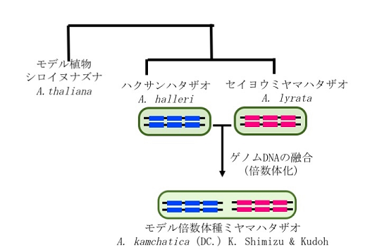 *1 倍数体:ゲノム重複によって二組以上の染色体を持つ個体。ミヤマハタザオはハクサンハタザオとセイヨウミヤマハタザオという2種の二倍体両親から生まれた異質四倍体である。コムギは、3種の二倍体が融合した六倍体種である。