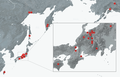 【図3】 日本を中心とした環太平洋北部にわたるミヤマハタザオの分布域全体から収集した25個体のゲノム解析を行った(Paape et al. の図より)。