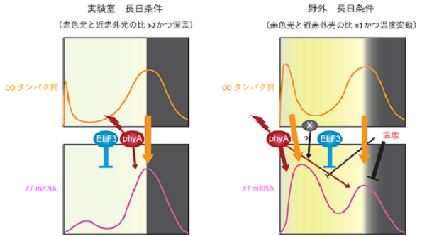 今回、発見した野外と実験室内でのFT遺伝子の発現時期の違いは、現在世界中の研究室で用いられている栽培条件が野外の実際の条件を正確には反映していないことを示しています。そこで本研究では、これまでの標準的な室内栽培条件の見直しを行い、野外でのFT遺伝子の振る舞いを実験室内で再現することに成功しました。この条件を用いて野外での開花メカニズムをつかさどる因子の解析を進めた結果、赤色・遠赤色光受容体であるフィトクロムAなどが植物の開花に特に重要であることが新たに分かりました。
