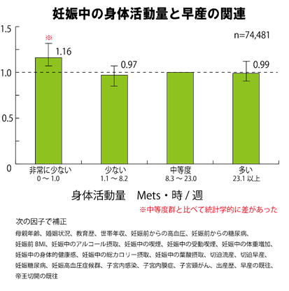 横浜市立大学附属市民総合医療センター 総合周産期母子医療センター 髙見美緒助教および、富山大学医学部公衆衛生学講座 𡈽田暁子助手らの研究グループは、妊娠期に中等度の身体活動量がある群と比較して、身体活動量が非常に少ない群では早産の発生が多くなることを明らかにしました。