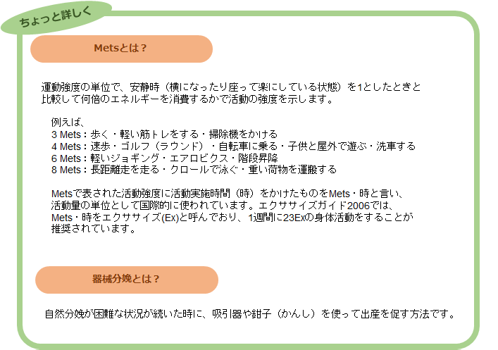 この度比較の基準とした「中等度」という身体活動量は、厚生労働省が推奨する身体活動量「1週間に23Mets・時」よりやや少ない程度の身体活動をしているグループです。ですので、早産や分娩方法への影響に関しては、「1週間に8~23Mets・時」程度の適度な身体活動をすることが推奨されます。