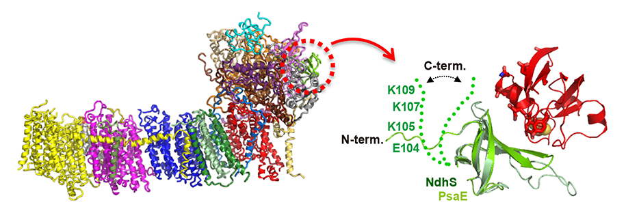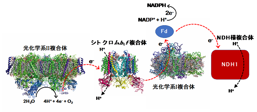 Fd(フェレドキシン)の結合によりチラコイド膜に電子を回収・循環させる仕組み。NDH様複合体(NDH1)だけ立体構造が判っていなかった。