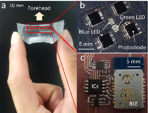図2 ウェアラブル黄疸センサの写真. a. 約3センチのセンサ、b. 2つのLEDからの反射光を4つのフォトダイオードで計測. c. デバイス上の小型ICとBluetoothモジュール