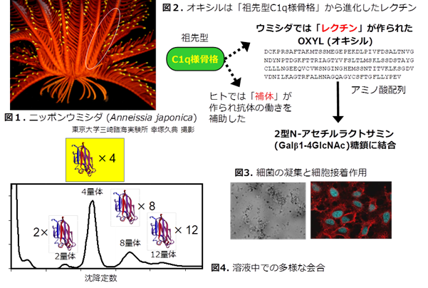 横浜市立大学大学院 生命ナノシステム科学研究科 イムティアジ・ハサン大学院生、大関泰裕教授、イタリア共和国トリエステ大学 生命科学部 マルコ・ジェルドル研究員、長崎国際大学大学院 薬学研究科 藤井佑樹講師は、東京大学大学院 理学系研究科附属臨海実験所(通称 三崎臨海実験所 岡 良隆 所長)が飼育する、原始的なグループの棘皮動物であるニッポンウミシダから発見したレクチン(糖鎖結合性タンパク質)が、ヒトの免疫分子である補体C1qと類似のアミノ酸配列を有していることを明らかにしました。レクチンは、血清糖タンパク質の品質管理や細胞の増殖制御など多様な働きを持ち、多くの構造が存在します。しかし、それらの由来については明らかではありません。本研究は、レクチンの構造のひとつが補体C1qと共通の祖先である骨格に由来していることを明らかにしました。
