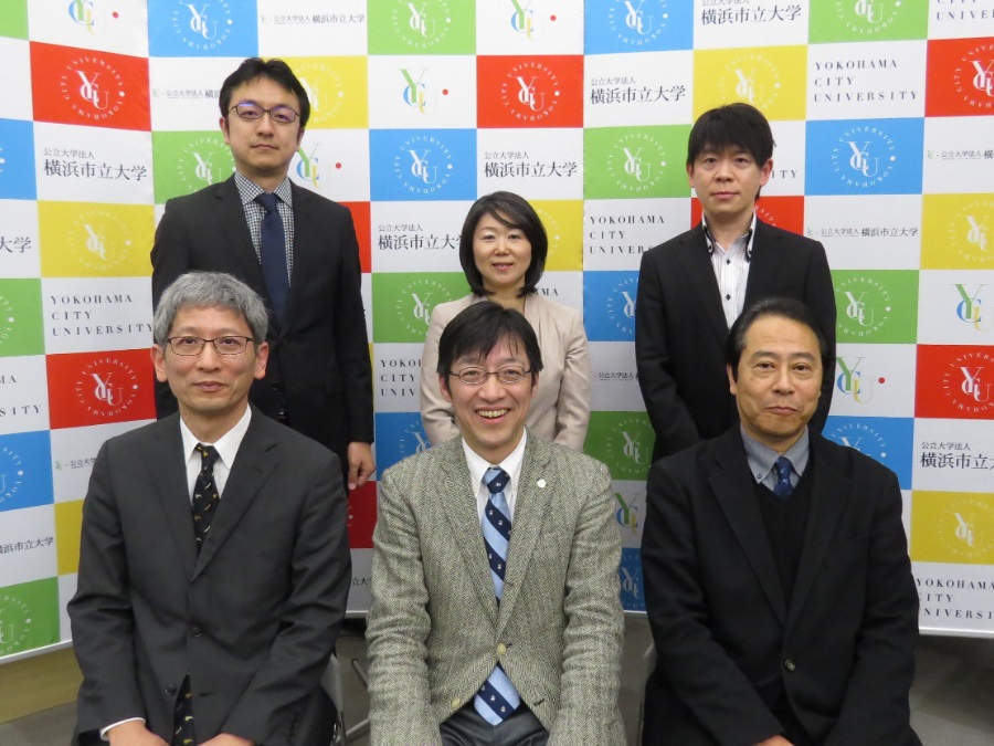 下段左から 小川教授、中條国際総合科学部長、竹居教授、上段左から 中園准教授、平松准教授、大島准教授