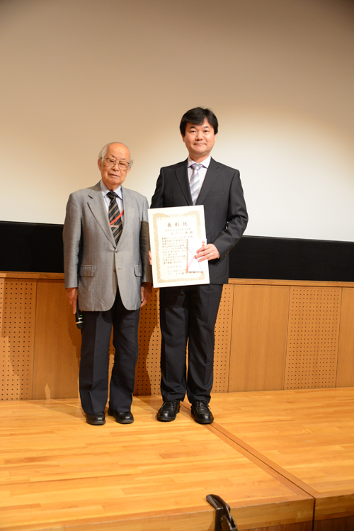 図1 コンピュータ化学会会長・細矢治夫氏から学会賞を授与される立川仁典教授