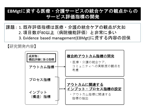 現在、介護療養型保険施設、介護老人保健施設などの介護保険施設の医療機能を評価するには、客観的な指標が乏しいことを理由に十分に行われていない現状があります。また、既存の評価指標では、医療と介護を複合的に評価することができず、評価項目数が多いなどの課題がありました。そこで、本研究では、医療・介護の複合的アウトカム指標の開発や、評価項目の精査、Evidence Based Management(以下、EBMgt)手法の効果検証などにより、各施設の医療機能を正確に捉えることができる指標の開発に取り組みます。
