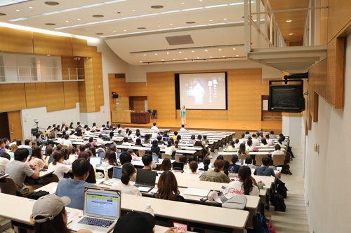 平成30年7月23日(月)、総合講義「現代社会とジェンダー」の最終講義に、女優で横浜夢座の座長を務める、五大路子氏が登壇しました。テーマは、ご自身が21年もの間、ひとり芝居で演じ続けている「横浜ローザ」という演目のモチーフとなった娼婦について。「ハマのメリーさん」と呼ばれたアメリカ兵相手の娼婦は、84歳で亡くなるまで、顔を白塗りにし、街角に立ち続けたと言います。その衝撃的な娼婦像に、日本人が受けた戦後史を重ね、舞台で演じ続けている五大氏。講義は、舞台シーンとともに、NY公演での観客のコメントなどを織り交ぜ、五大氏を紹介したテレビ番組の放映と、五大氏の迫力ある講話で、通常の授業とは一味違った進行となりました。