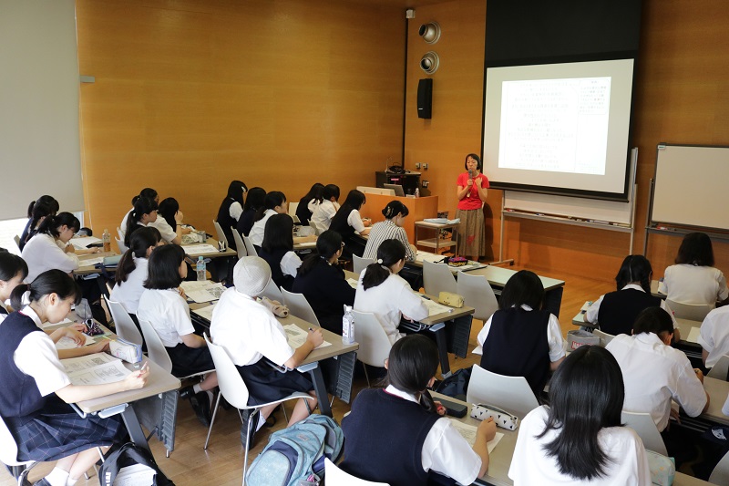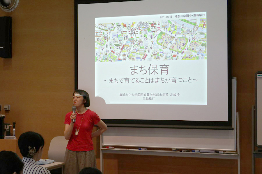 7月18日に、神奈川学園高等学校の1年B組の生徒36名が、YCUを訪問しました。1年B組は、9月に開催される文化祭で「赤ちゃん・こども」をクラスの研究・発表テーマに決め調査を進める中で、YCU国際教養学部の三輪律江准教授の著書「まち保育のススメ」を読み、地域社会が一緒になって子どもを育てる環境づくりに強い関心を持ったと言います。三輪先生は建築や都市計画を専門とし、少子化など社会や家庭の構造が変化する中で、地域や街そのものが子育ての環境としてより良いものになるためにはどうしたらよいかを研究している「まち保育」の研究者です。今回、三輪先生は「まち保育~まちで育てることはまちが育つこと」と題した特別講義を実施。後半では三輪ゼミの学生も参加するなど、約90分間活気のある授業が行われました。