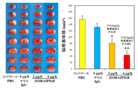 そこで虚血48時間前から、脳室内に持続ポンプを留置して抗ORAIP中和抗体を投与すると、用量依存的に脳梗塞(虚血再灌流障害)領域の著明な減少を確認しました(6 µg/hで73時間投与、コントロール群より約72%の減少。図1)。さらに、抗ORAIP中和抗体を虚血再灌流直後に投与した場合でも脳梗塞領域の著明な減少が認められました(288 µg/hで30分間投与、コントロール群より約55%の減少。図2)。つまり臨床では不可能な虚血前からの投与ではなく、脳梗塞発症後の虚血後からでも抗ORAIP中和抗体を投与することで脳梗塞体積を著明に減少することができました。今回の研究により、従来考えられてきた活性酸素ではなくORAIPが酸化ストレスによるアポトーシス誘導に重要な働きをしていることが確認されました。抗ORAIP抗体が今後製薬化、臨床治験が行われ、実臨床で使用されることで、脳梗塞患者さんの予後改善に多大に寄与する可能性が示唆されました。