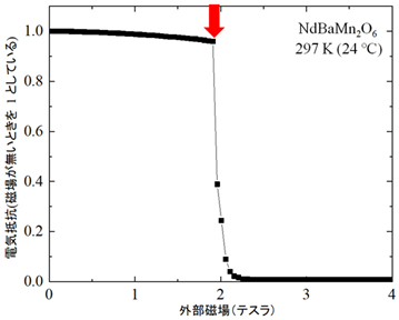 左図は 24℃ での当該物質の電気抵抗(電気の流れにくさ)が、置かれた磁場の強さに対して変化する様子。電気抵抗は、磁場が無いときを1としている。