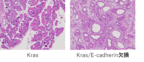 膵臓特異的にE-cadherinを欠損させると、膵腺房細胞は崩壊し、膵炎様の所見を呈する。一方、KRas変異の存在下では前癌病変であるPanINを速やかに形成する。