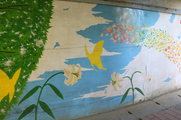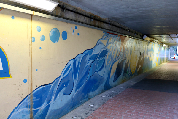 壁画は、金沢区をイメージして、駅側から入ると海を感じ、奥に進むと森へと変化していく「海から森へ」がコンセプト。京浜急行電鉄や金沢区役所、金沢土木事務所等、多くの方々のご尽力によって蛍光灯やサインも整備されました。おかげで懸念だった落書きの悩みからも解放。トンネル通路は、長きにわたり、道行く人を明るく照らし、癒しを与えてくれました。