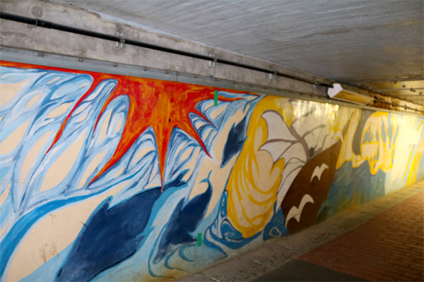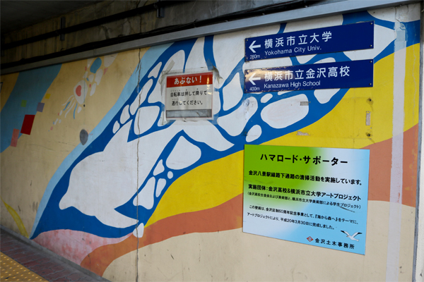 令和2年1月中旬から令和2年3月まで、金沢八景駅の線路下通路が閉鎖され、トンネル内壁面の補強工事が行われることになりました。このため、両側に描かれていた壁画も無くなってしまうことが決定。通学路を明るくするために、学生達によって制作された思い出深い壁画も、11年の長い役目を終えます。