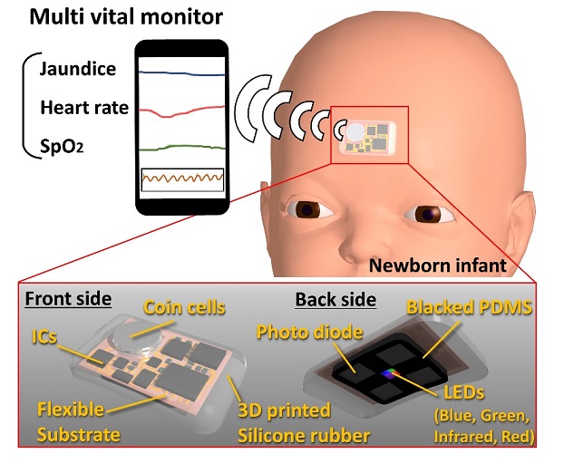横浜市立大学医学部小児科学の伊藤秀一主任教授、魚住梓助教、横浜国立大学工学研究院の太田裕貴准教授らの研究グループは、新生児用ウェアラブルデバイスのためのマルチバイタルセンサを開発しました。ゴム材料などの柔軟な材料を新生児とデバイスのインターフェースに用いることによって新生児に対して負荷が低く、高密着に装着できるウェアラブル型の黄疸、経皮的動脈血酸素飽和度(SpO2)、脈拍など複数バイタルサインの同時計測が可能なマルチバイタルセンサを実現しました。また、現在はバイタルサインの計測精度を向上させるとともに、その他のバイタルサインも同時に検出できるようなデバイスへ発展することで新生児医療の高度化が期待できます。本研究は戦略的情報通信研究開発推進事業(SCOPE)(No. 181603007)のサポートの元で行われました。