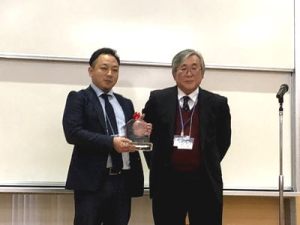 日本薬学会九州支部長(右 長崎大学大学院教授 田中 隆氏)より学術奨励賞の盾を渡された藤井佑樹さん(左 長崎国際大学大学院薬学研究科講師)