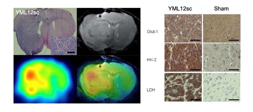 当施設症例のFDG-PET結果を後方視的に検討したところ、正常脳白質と比較して腫瘍部では約4倍超のFDG集積が認められました。解糖系蛋白発現を比較すると、腫瘍部では解糖系関連蛋白であるglucose transporter 1(Glut-1)やhexokinase 2(HK-2)が正常脳と比較して高発現していました。同様にPDXモデルにおいてもFDG高集積、Glut-1, HK-2高発現を確認しました。そこで解糖系を阻害することによる抗腫瘍効果を検討するため、解糖系を標的とした阻害剤さらにはshRNAを用いてGLUT1, HK2遺伝子を抑制したところ、細胞、動物モデルで強い抗腫瘍効果が認められました。このことから強い糖代謝はPCNSLの生存に重要な役割を果たしていることが判明しました。