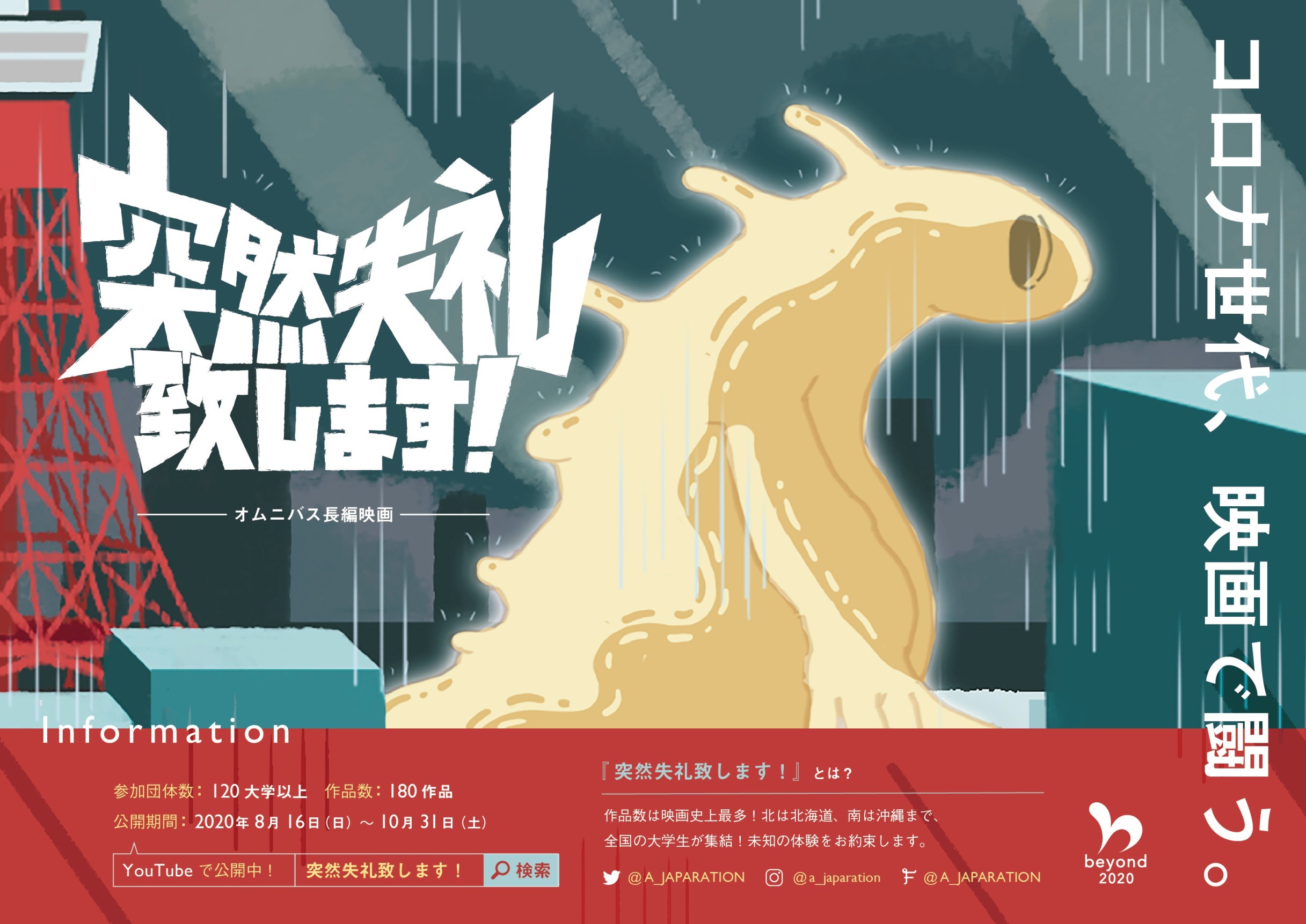 2020年4月に立ち上がった120以上大学サークル・クラブによる180本の映画をおさめた1つのオムニバス作品を創るプロジェクト。目的は、コロナ禍で自粛を余儀なくされる中で、先の見えない不安、制限される自由の中でも創作活動によって芸術交流や学生映画を発展させること。プロジェクトの条件は、制作は3密を回避する、映像作品は1分以内の2つを守ること。