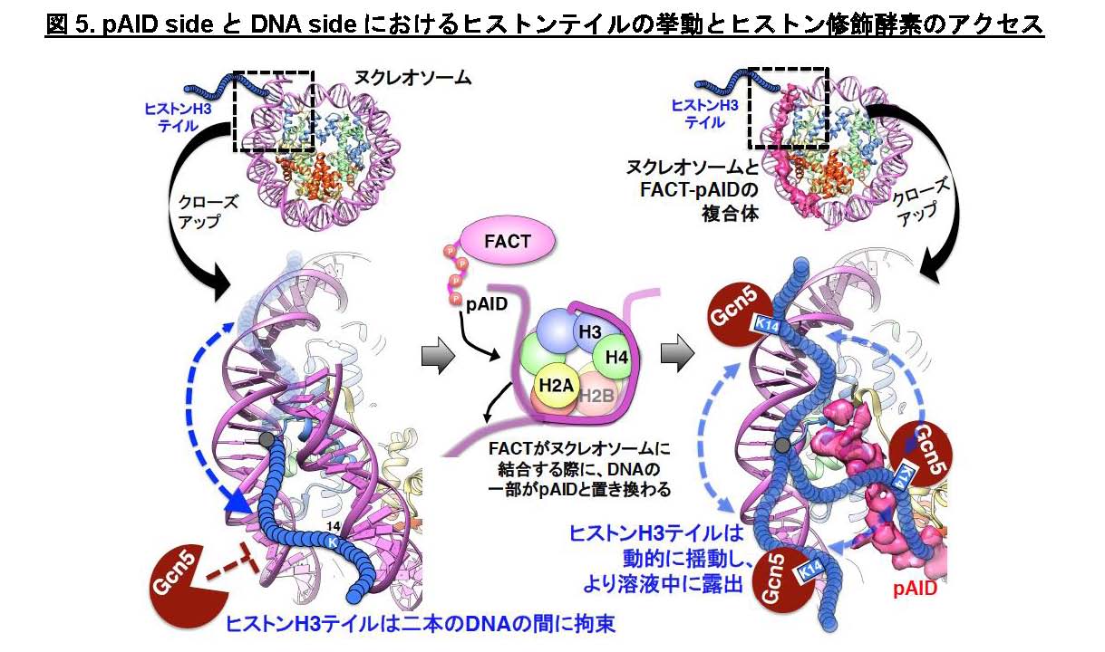 本研究では、ヌクレオソーム中のDNAがFACTのpAID領域と一部置換された複合体のヒストンH3テイルを本学の高磁場NMR分光器を用いて解析し、H3テイルの各々のアミノ酸残基が二つの分離したNMRシグナルとして観察されること発見しました (図3青)。これは同様の電子顕微鏡構造では全く可視化できなかったヒストンH3テイルが二つの異なる動的構造をとることを示しています。これら二つの動的構造は、FACTとヌクレオソームの複合体の非対称な電子顕微鏡構造を反映しており、一方はヒストンテイルが通常のヌクレオソームと同じ二つのDNAによって囲まれた配置(DNA side)、もう一方はpAID蛋白質とDNAによって挟まれた配置(pAID side)と考えられます(図2)。この考察と一致して、二つのNMRシグナルの一方は、対称的な構造をとる通常のヌクレオソームのH3テイルのシグナル(図3赤)とほとんど重なったため、DNA sideのH3 テイルに対応します。一方、もう片方のシグナルは通常のヌクレオソームを高塩濃度(200 mM NaCl)の条件下で観察した場合のNMRシグナル(図3黄)とほぼ重なります。これは、このpAID sideに対応するH3テイルが、高塩濃度によってDNAとの相互作用が弱められた状態と同様に、DNAから解放されたより動的な構造を取っていることを示します。これらの結果と合致して、 pAID sideのH3テイルは、DNA sideやヌクレオソームのH3テイルに比べて、Gcn5というヒストンアセチル化酵素によるH3の14番目のリシン残基のアセチル化の速度が早くなることも見出しました(図4)。つまり、pAID sideのH3 Nテイルは動的にDNAやpAIDと相互作用しながら、より溶液中に露出しており、ヒストン修飾酵素などの影響を受けやすいのに対して、DNA sideや通常のヌクレオソームのH3テイルはヌクレオソームの二本のDNAに囲まれた構造スペースにその相互作用により拘束されていて、ヒストン修飾酵素のアクセスを強く阻害することがわかりました (図5)。