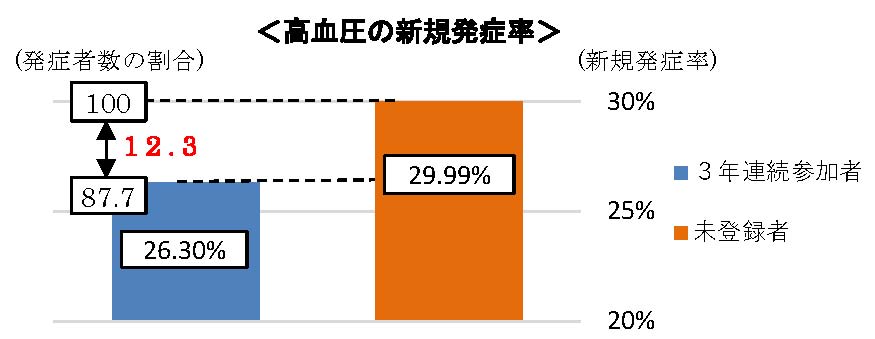 60歳代において、結果に影響を及ぼす可能性のある背景要因を揃えた結果、3年連続参加者の中で高血圧を新規発症した割合は26.30%、未登録者の同割合は29.99%で、3年連続参加者の方が3.69ポイント低くなっていました。これを実際に高血圧を新規に発症した人数で比較すると、3年連続参加者の発症者は未登録者の発症者より12.3%少なくなっていました。【※1】