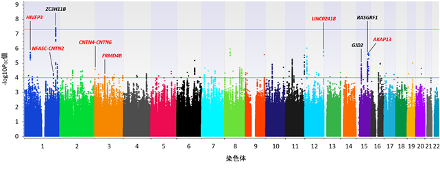GWASで解析された約500万個のSNPをグラフにプロットした。横軸が染色体ごとのSNPの位置を、縦軸が強度近視との相関性を示す。上に位置するSNPほど、強度近視との相関性が強い。本研究で新規に同定された疾患感受性遺伝子領域を赤字で記した。