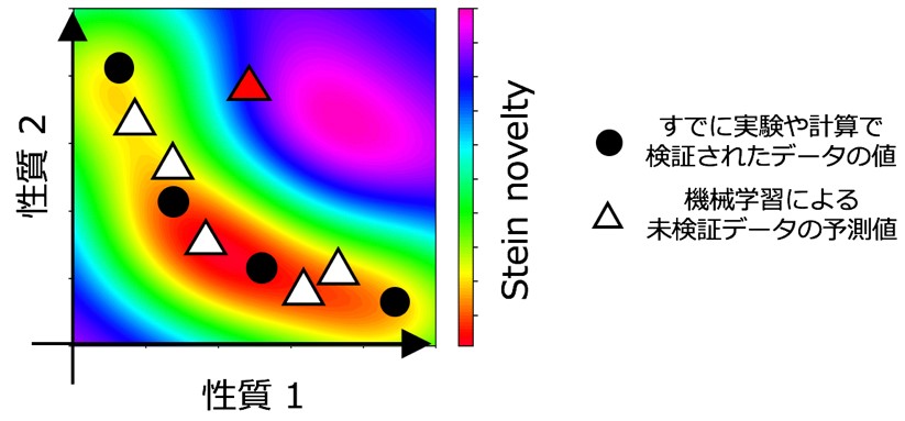黒丸は、既知物質のデータの分布を示しており、しばしば性質1と2の間にトレードオフが存在する。三角(赤三角を含む)は機械学習モデルによって予測され、まだ検証されていないデータの予測値を示している。例外的な物質は、既知物質のデータの分布から最も外れたものである。分布からの外れ具合をStein noveltyで定量化すると、赤三角が選択される。