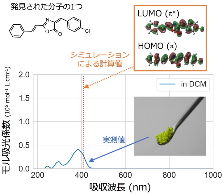 ZINCデータベースに含まれる10万個の分子から、BLOXとDFT計算を組み合わせて例外的な光吸収特性を持つ分子を2,000回探索し、例外的でない分子も含めて2,000個が得られました(図2)。すると、ランダムな探索により得られた分子の分布に比べて分布が大きく広がり、例外的な分子の候補を多数発見しました。さらに、DFT計算に基づいた光吸収特性が例外的な候補分子の中から8個を実際に準備し、実験的に光吸収特性を測定しました(図2)。その結果、光の吸収波長・強度ともに、DFT計算で予測された値とほぼ一致し、BLOXとDFT計算を組み合わせることで例外的な分子が効率的に発見できることが実証されました(図3)。