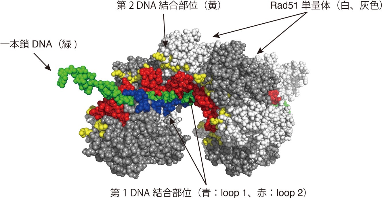 Rad51単量体を、白または灰色の球を用いた空間充填モデルで表した。それぞれの分子の第1 DNA結合部位中のloop 1を青色、loop 2を赤色で表すと、一本鎖DNA (緑色)を挟む配置をとる。第2 DNA結合部位は黄色で示した位置にあり、一本鎖DNAからは少し離れていることがわかる。このモデルでは10分子からなるRad51が一本鎖DNA上にらせん状に結合したフィラメントを表しているが、実際の細胞内では数千個ものRad51分子が一本鎖DNAに結合し、フィラメント構造を形成すると考えられている。