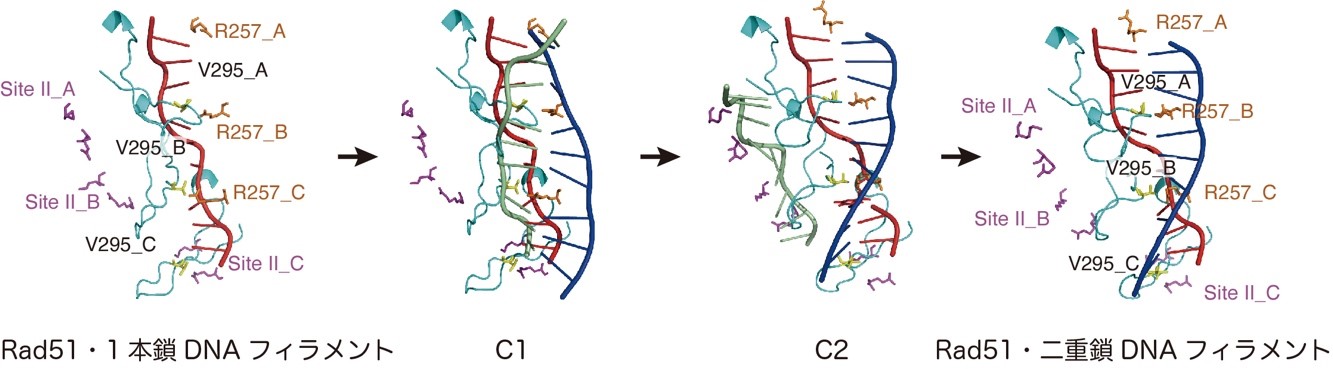 R257はloop 1に存在する鎖交換活性に重要な残基、V295はloop 2に存在する鎖交換活性に重要な残基、site IIは第2 DNA結合部位を形成する2つの重要なアミノ酸を示している。Rad51の単量体をA、 B、 Cで表しており、「R257_A」は「AサブユニットのR257残基」を指す。最初に形成されるRad51・一本鎖DNAフィラメントが二重鎖DNA(青色と緑色の鎖からなる二重鎖)を捕捉し、最初のC1複合体を形成する。その後、鎖を交換してヘテロ二重鎖(赤色と青色の鎖からなる二重鎖)を含むC2複合体ができ、最終的に、一本鎖DNA(緑色)を放出して、Rad51・二重鎖DNAフィラメントが形成される。