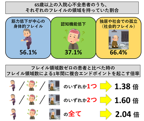 心不全は、心臓が悪いために息切れやむくみが起こり、徐々に悪化する命にかかわる病気で、国内では2035年までにその患者数は130万人に達するとされています。いままでに数々の薬剤や手術療法が開発されていますが、そもそも高齢患者はフレイルと呼ばれる「病気の悪化に対して脆弱な状態」である場合が多く、既存の治療を行っても効果が不十分なことが課題となっています。筋力や運動機能が低下する「身体的フレイル」は既によく知られていますが独居や社会的に孤立する「社会的フレイル」や「認知機能の低下」を含んだ幅広い概念です。今回、研究グループは高齢心不全患者においてこの多領域にわたるフレイルを包括的に調べることにより、各領域のフレイルがどれだけの頻度で認められるか、どの程度重なり合って存在しているのか、またフレイルを持った患者が命を落としたり入院が必要となる複合エンドポイントへのリスクはどのくらいかを明らかにすることを目的に、多施設での患者情報を登録し経過を追う観察研究を実施しました。