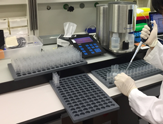 図1 花粉数計測中の風景 量的形質である花粉数の違いを検出するため、多検体を短時間で計測できる実験系を確立した。これまでの顕微鏡下で花粉数を数えていた場合に比べて5倍以上の効率を実現した。