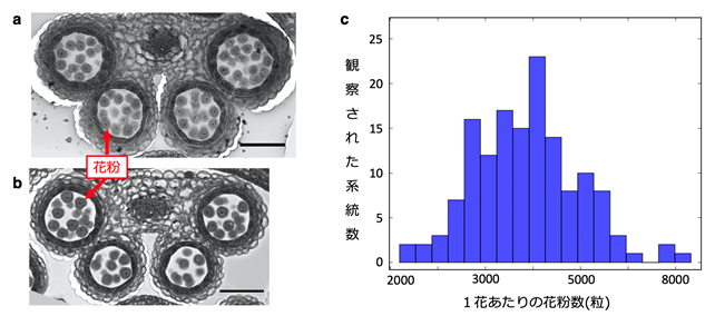 図2 シロイヌナズナにおける花粉数の分布 花粉数の多い系統(a)と少ない系統(b)の雄しべの切片画像。(c)144系統を調べた結果の種内のばらつき。横軸は対数表示。(1花あたりの花粉数は2000-8000粒と差がみられる。(論文より)