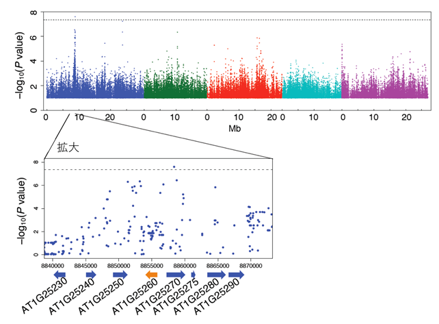 図3 GWASの結果を示すマンハッタンプロット 1つの点が使用したSNPに対応している。色の違いは染色体の違い。高い位置にあればあるほどそのSNPの違いと表現型(今回は花粉数)の違いの相関が高い、つまり原因遺伝子が近傍にある可能性が高いことを示している。今回、有意だった場所以外にも何箇所か高い相関を示すところがあり、他の遺伝子の関与も予想される。拡大図中の矢印は遺伝子の位置と方向を示している。オレンジの遺伝子が今回の発見となったRDP1遺伝子。