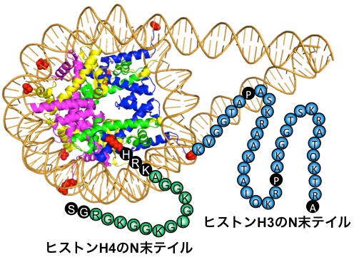 H3とH4の末端(N末テイル)構造の模式図。中核構造のらせん部位はヒストンH2Aが黄、H2Bが赤、H3が青、H4が緑で示されていて各々2個あり、その周りをDNAが巻き付いている詳細な構造が分かっていたが、紐様に伸びているヒストンH3とH4の末端(テイル)の構造は今まで全く分かっていなかった。