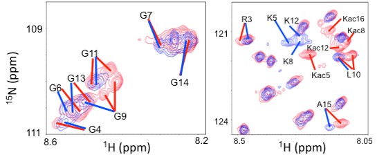 本研究では、ヌクレオソーム中のヒストンH3及びH4末端を本学の高磁場NMR分光器を用いて解析し、ヒストンH4末端に4個のアセチル化が入ると、同一ヌクレオソーム中のヒストンH3末端の挙動も変化することを見出しました。我々は、H4末端の5番、8番、12番、16番のリシンがアセチル化したヌクレオソーとアセチル化していないヌクレオソームを調製し、2種類のヌクレオソーム中のヒストンH3とH4の末端の動的構造をNMRスペクトルで比較しました(図2、図3)