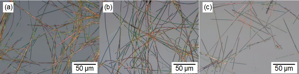 図1.3種類の溶媒を用いて育成されたC60ナノウィスカーの光学顕微鏡像