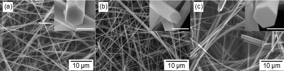図2.図1の3種類のC60ナノウィスカーの走査型電子顕微鏡像
