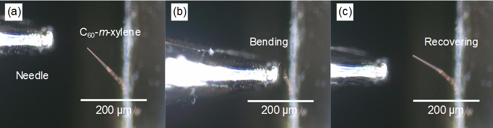 図3.mキシレン溶媒を用いて作製されたC60ナノウィスカーの曲げ変形による