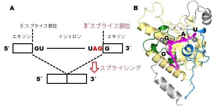 高等生物のDNAには、タンパク質として翻訳される領域(エキソン)と翻訳されない領域(イントロン)が存在しており、イントロンはRNAに転写された後に取り除かれる。このイントロンを取り除きおよびエキソンをつなぎ合わせる反応をスプライシングという。