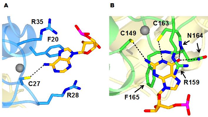 その結果、U2AF1の持つ二つの亜鉛結合モチーフ(*5)が、3´スプライス部位の持つ塩基配列(AG)を配列特異的に認識する、その分子機構を明らかにしました(図2)。AGのA塩基は、Phe20とのスタッキング相互作用により強く結合し、亜鉛に配位しているCys27との水素結合により塩基特異的に認識されていました。AGのG塩基は、Phe165とのスタッキング相互作用により強く結合し、こちらも亜鉛に配位しているCys149やCys163との水素結合により塩基特異的に認識されていることがわかりました。