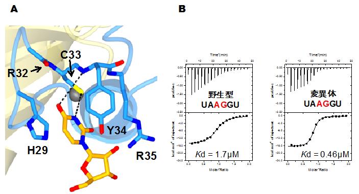 【図3:U2AF1変異体による塩基認識機構】A; U2AF1病気患者変異体S34Yによる変異体特異的な塩基認識機構。図2同様、黄色の線がRNAを示している。黒丸は亜鉛原子。 B; 等温滴定熱量計によるU2AF1とRNAの結合能測定。Kdの数値が小さいほど結合親和性が強い。