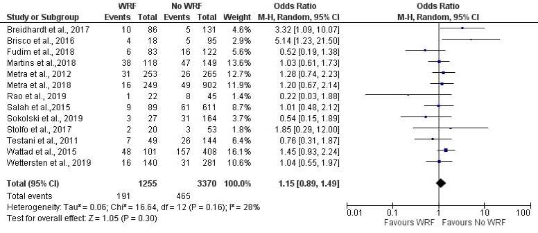 WRF合併の有無で2群に分けた場合、WRF合併あり群は、WRF合併なし群より死亡率が高いことがわかりました(OR 1.71, 95% CI 1.45 to 2.01, p < 0.00001)(図2)。これに対しWRF合併あり群をさらにうっ血改善所見の有無で2群に分けたところ、WRF合併あり/うっ血改善所見のある群とWRF合併なし群とでは死亡率に有意差を認めませんでした(OR 1.15, 95% CI 0.89 to 1.49, p =0.30)(図3)。WRFの定義、フォローアップ期間、うっ血改善の定義で感度解析を行いましたが、いずれも同様の傾向を示しました。