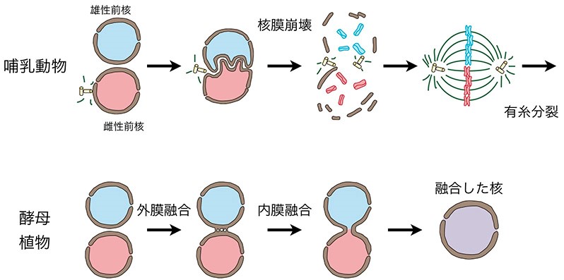 ヒトを含む哺乳動物の受精では、最初の体細胞分裂の際に、核膜の崩壊と再構築をともなって雌雄の核が融合する。一方で、出芽酵母や植物の有性生殖過程で観察される核融合では核膜が崩壊しないため、核外膜融合と核内膜融合の2回の膜融合過程を経て2つの核が融合する。