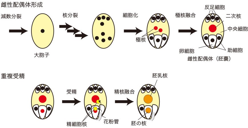 (上図)雌性配偶体形成過程では、中央細胞で2つの極核が融合する(極核融合)。