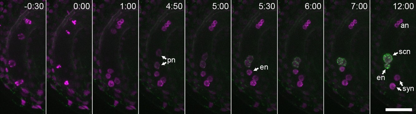 雌性配偶体形成過程でのGEX1(緑色)の発現と局在の経時観察を行った。GEX1は極核(pn)が融合して二次核(scn)となる過程で極核に現れ、次いで卵細胞核(en)に出現した。細胞核の位置をマゼンタで示す。数字は撮影をおこなった時間(時:分)。