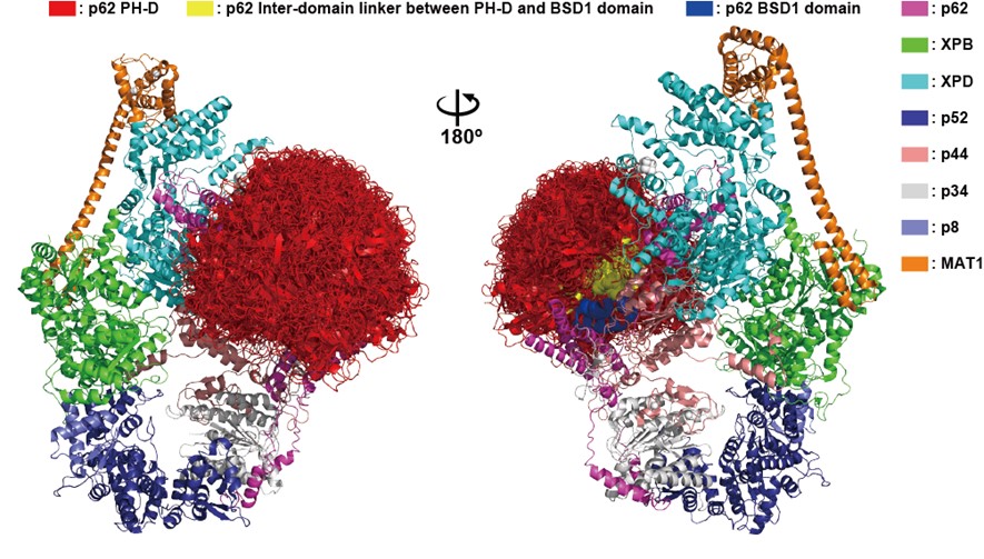 以上の結果から、TFIIH複合体中でp62のPHドメインは自由に振る舞うものの、その後ろの五アミノ酸残基の短いリンカーにより特定の範囲内に限られることが分かりました。相互作用するタンパク質との複合体モデルは、転写やDNA修復反応が開始される初期段階の様子を表していると考えられます。