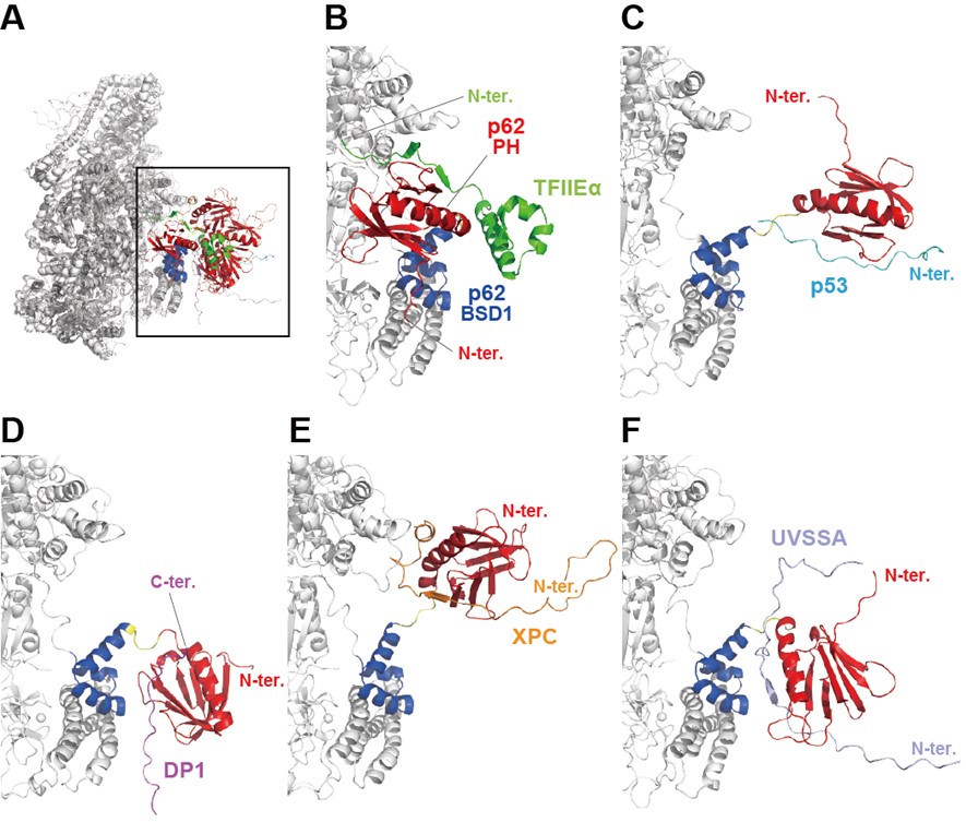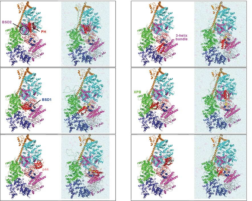 続いて、TFIIH複合体と基本転写因子TFIIEα、癌抑制因子p53、転写因子DP1、DNA修復因子のXPCとUVSSAとのドッキング構造を初期構造としスーパーコンピュータにより分子動力学(MD)シミュレーションから精密化を行いました(図2)。MDにより、溶媒分子を含む生体内環境で、TFIIHのPHドメインとドッキングした因子タンパク質の相互作用様式が精密化できました。