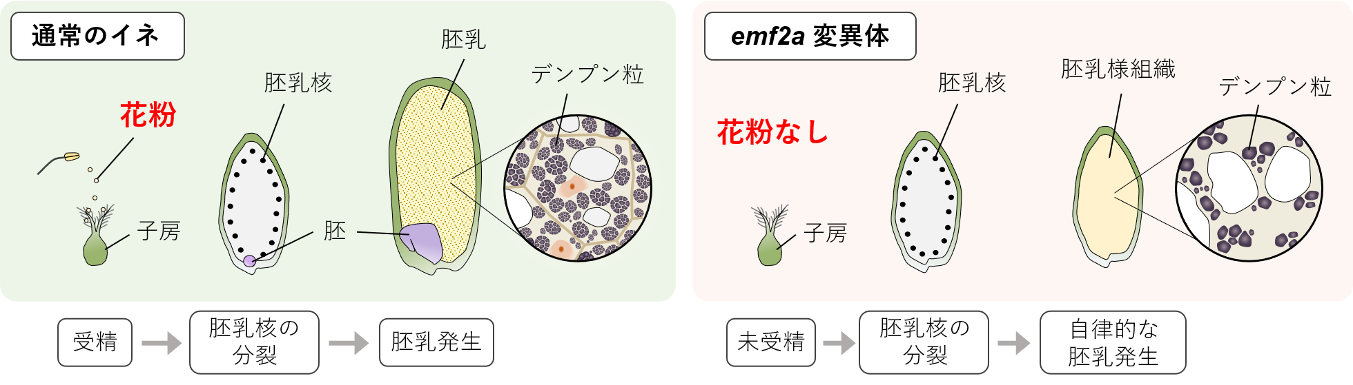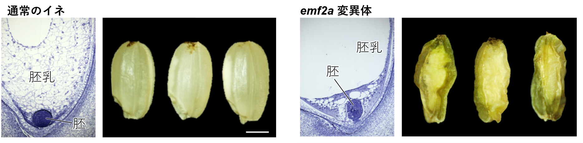 図1.通常のイネにおける胚乳発生(左)とemf2a変異体における自律的な胚乳発生(右)