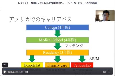 令和2年12月9日(水)に医学国際化セミナー「レジデンシー奮闘記 in NY」を開催しました。本セミナーはで、ニューヨークMount Sinai Beth Israel病院のレジデントとして3年目となる山田貴之医師を講師に迎え、お話いただきました。開催にあたっては、講師のご意向も踏まえ、他大学・機関からの参加も受入れたことより、104名とたいへん多くの申込をいただきました。