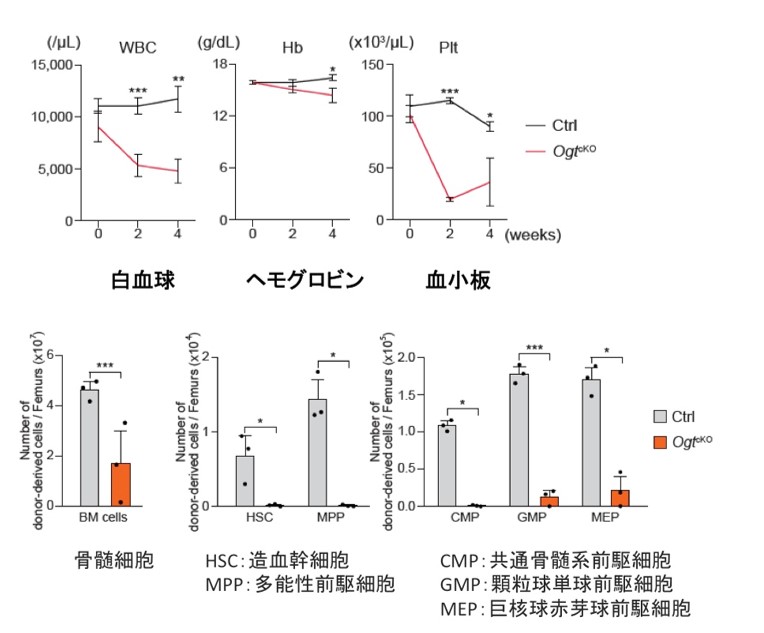研究者らのグループはGlcNAc修飾の造血幹細胞における役割を明らかにするため、まず造血系におけるOGTの発現量とGlcNAc修飾を受けているたんぱくの量を調べました。すると成熟した細胞に比べて造血幹細胞を含む未熟な造血細胞ではOGTの発現が高く、GlcNAc修飾を受けているたんぱく質の量も多いことがわかりました。このことから、OGTによるGlcNAc修飾は造血幹細胞で重要な役割を担っている可能性が示唆されました。続いてOGTをマウスの血液細胞全体で欠失させたところ、白血球・赤血球・血小板が急激に減少し、さらに骨髄では造血幹細胞や未熟な前駆細胞*4が広く失われてしまうことが明らかとなりました(図1)。このことは、OGTが造血幹細胞を維持するのに必須であることを示しています。